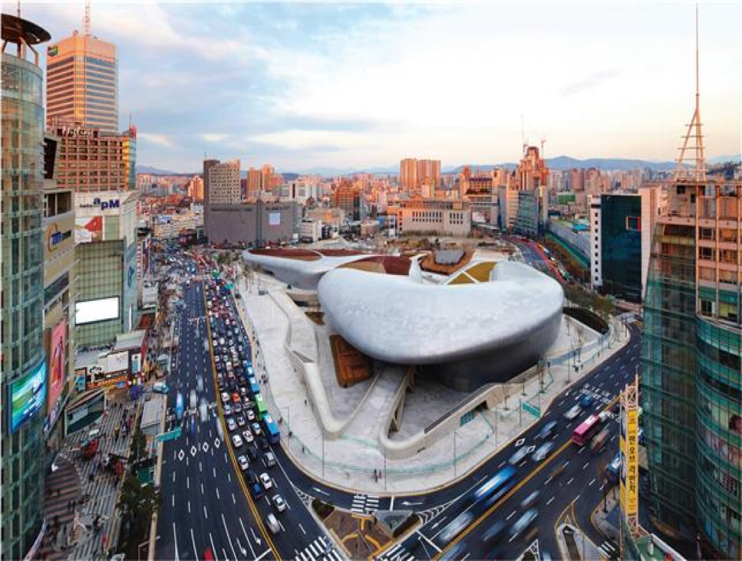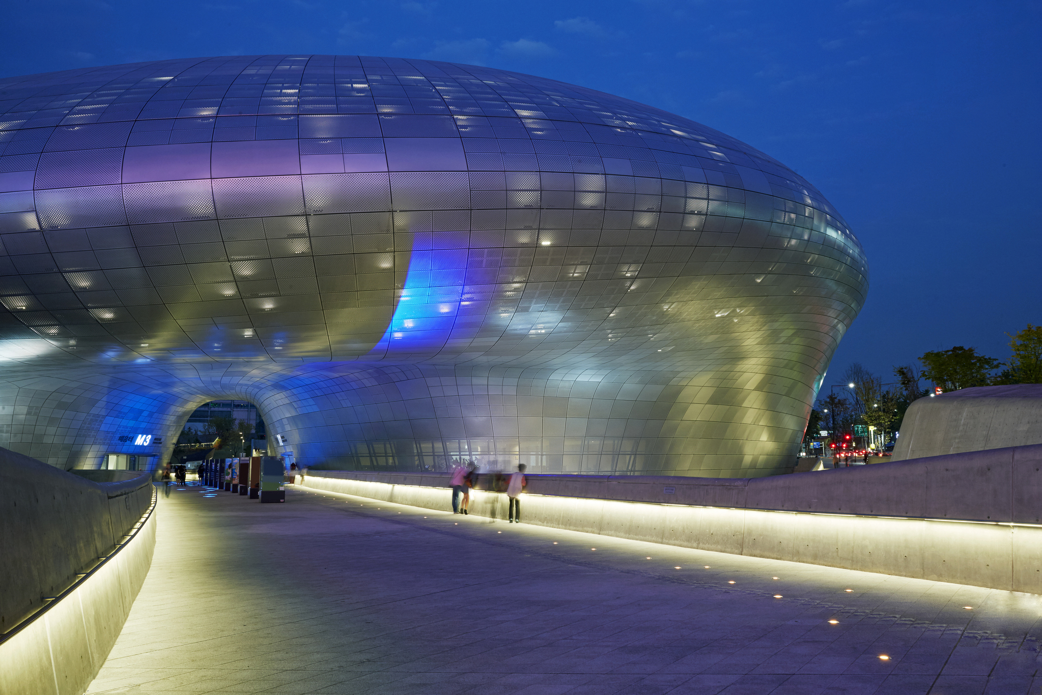 곡선 건축미를 활용한 DDP의 외관은 야경 촬영 명소로도 유명