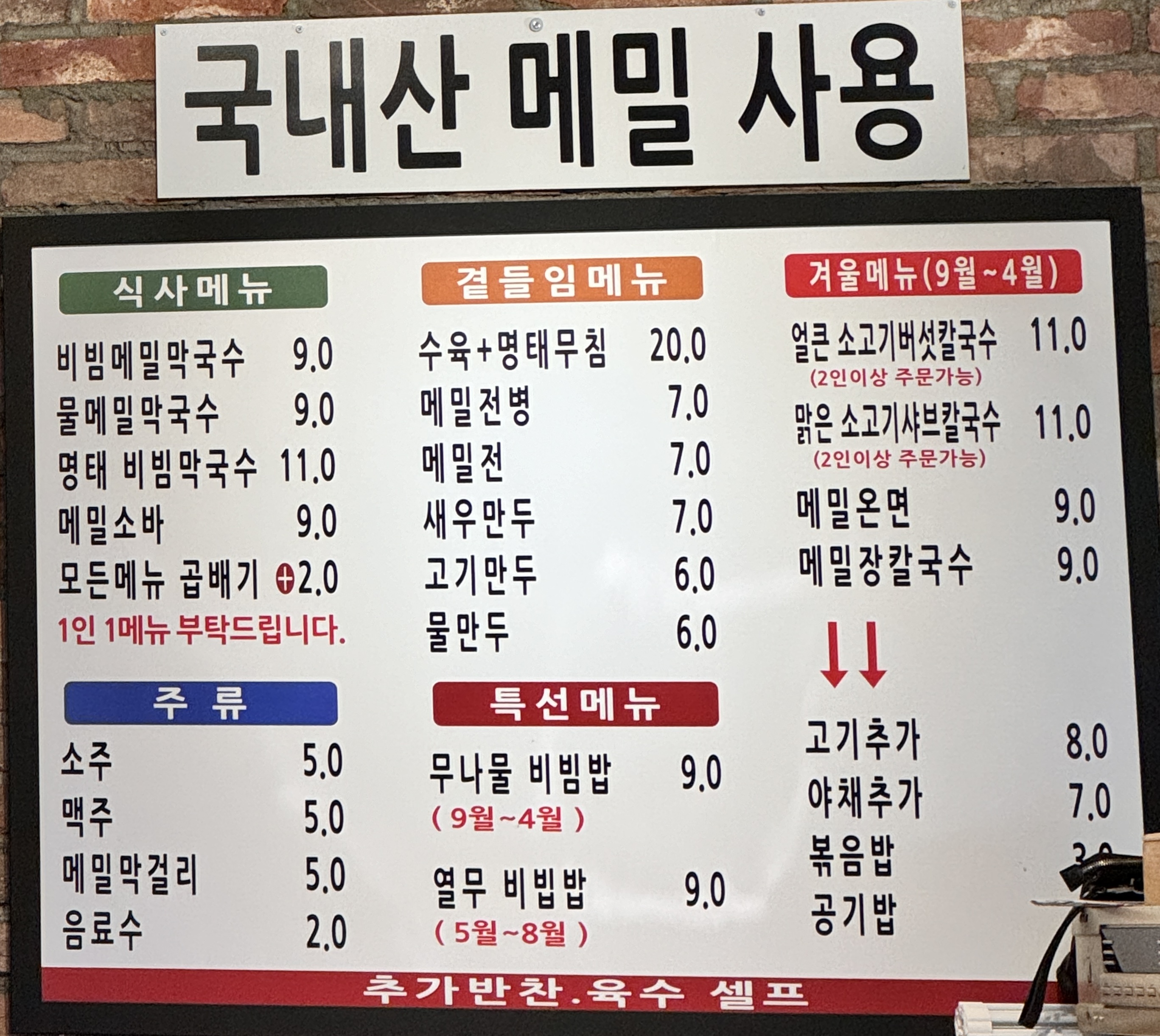 전골류(계절메뉴 9월~4월)와 메밀국수류에 제공되는 반찬이 약간 다른 것 같았어요. (김치 유무 정도)