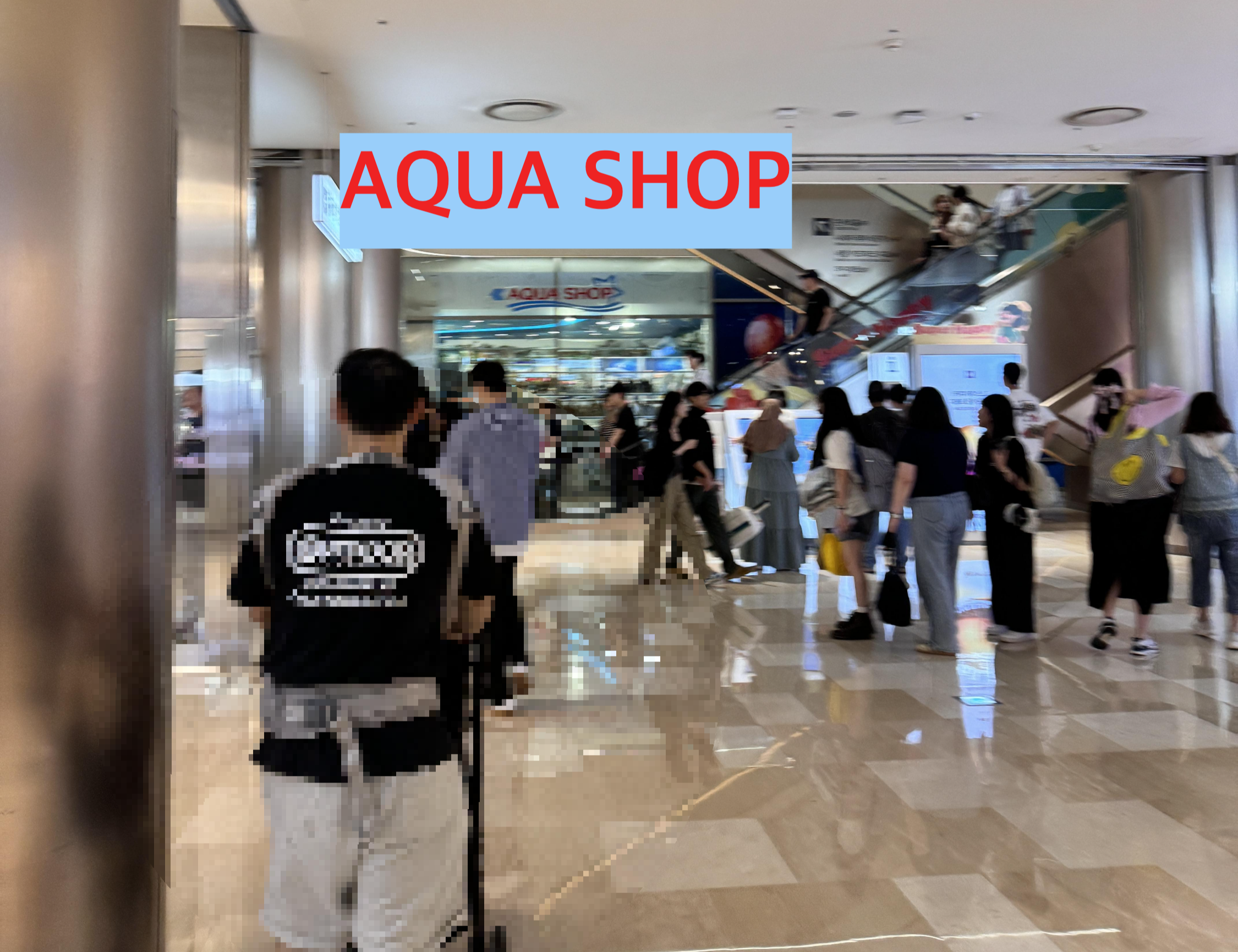 바로 정면으로는 AQUA SHOP이 보이실 거예요~! 여기서 주저하지 말고 상향 우측에 있는 상향 에스컬레이터로 이동합니다!!