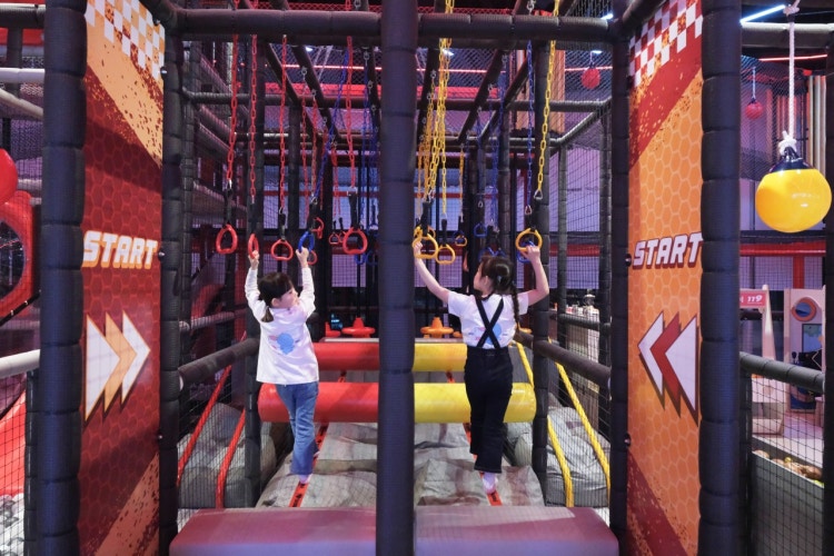 암벽등반, 트램폴린, 볼풀 슬라이드 등 다양한 액티비티를 즐길 수 있는 실내 놀이 공간이에요.